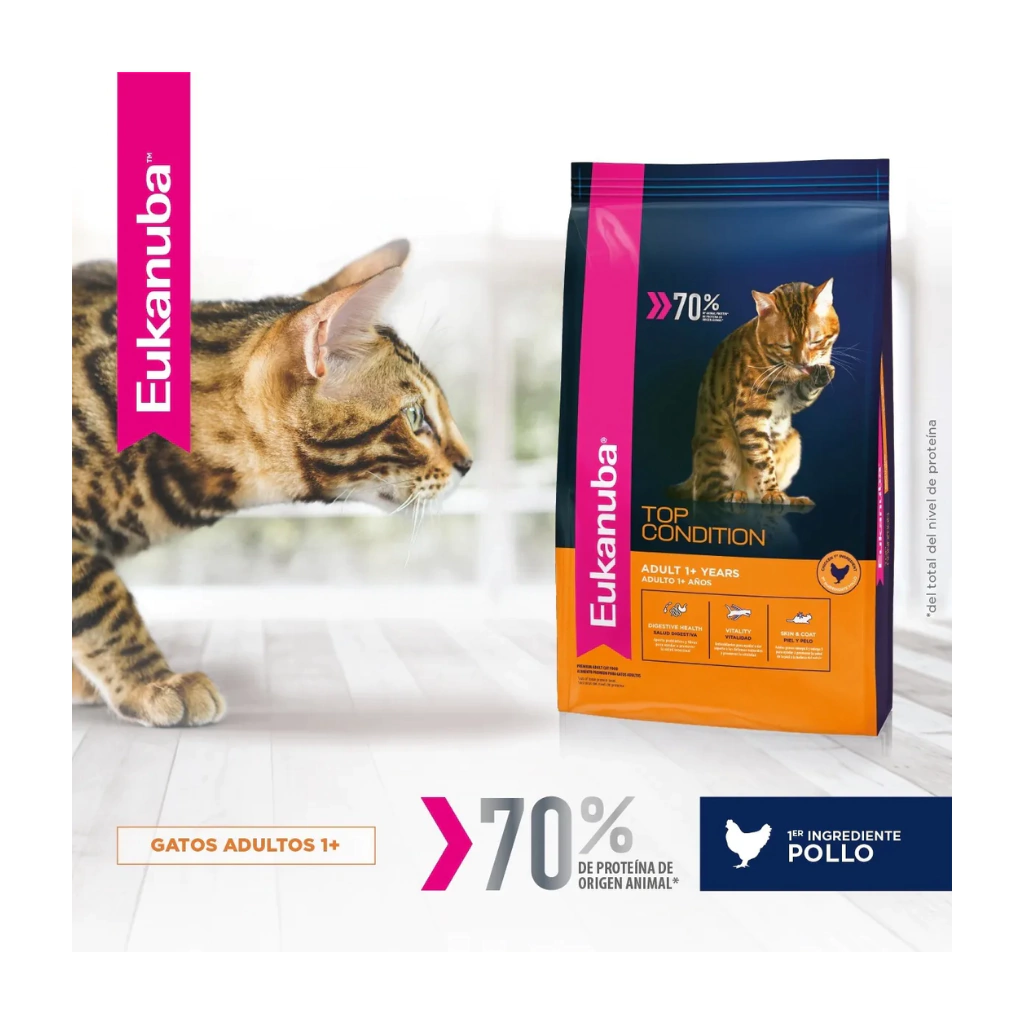 El alimento Eukanuba Gato Adulto Top Condition es un alimento seco completo y equilibrado para gatos adultos, diseñado para satisfacer sus necesidades nutricionales y contribuir a su salud general. Está formulado con un alto porcentaje de proteína animal, particularmente pollo fresco, lo que ayuda a desarrollar y mantener una musculatura compacta. Además, contiene antioxidantes y minerales esenciales, como vitamina E, calcio y fósforo, que apoyan el sistema inmunológico y los huesos fuertes.