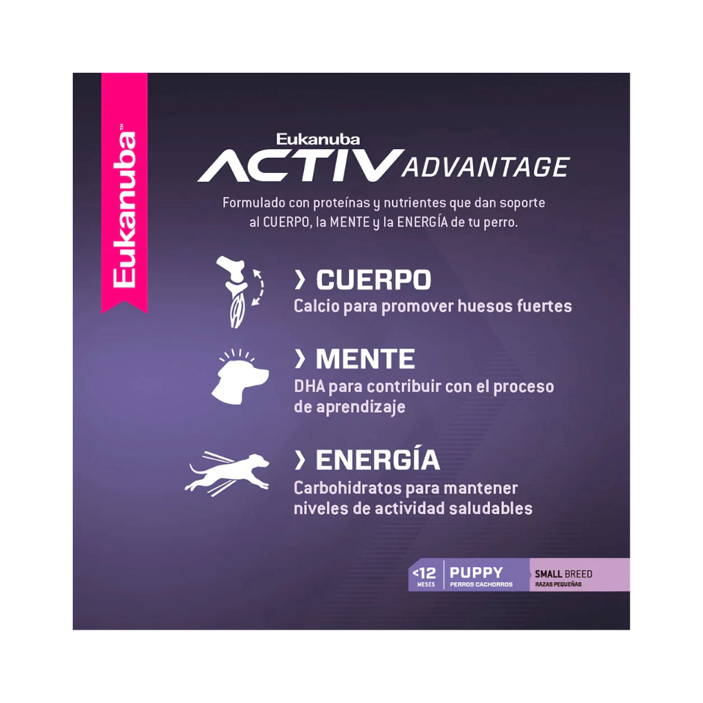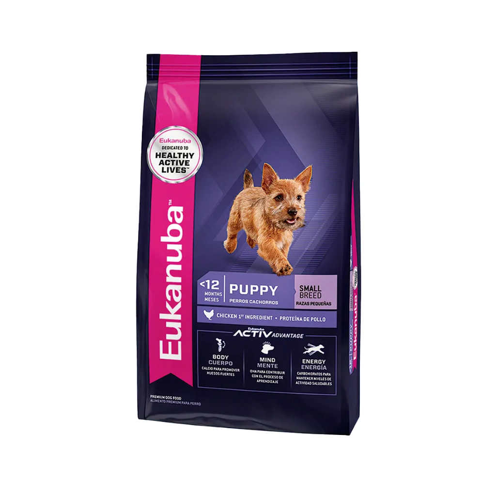 Eukanuba Puppy Small Breed es un alimento balanceado completo para cachorros entre 1 y 12 meses de edad y de razas pequeñas como Caniche, Yorkshire Terrier, Chihuahua, Daschund, Maltes y otras razas o perros mestizos que en su etapa adulta pesen menos de 10 kg. Las fórmulas para cachorro de Eukanuba, contienen niveles científicamente comprobados de DHA ara apoyar el óptimo desarrollo neurológico del cachorro y maximizar su capacidad de aprendizaje durante el entrenamiento. Contribuye a una óptima digestión, desarrollo y mantenimiento de músculos magros, articulaciones y huesos fuertes.