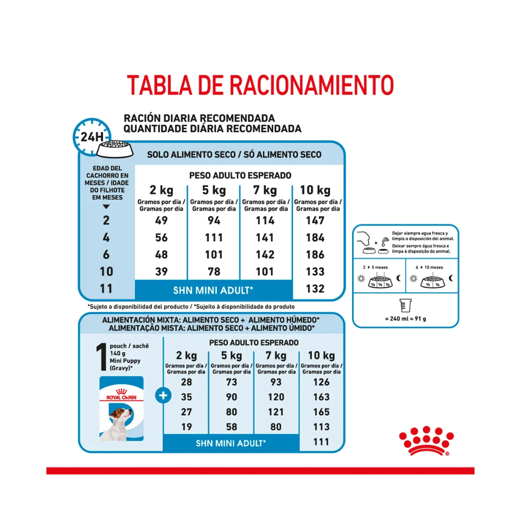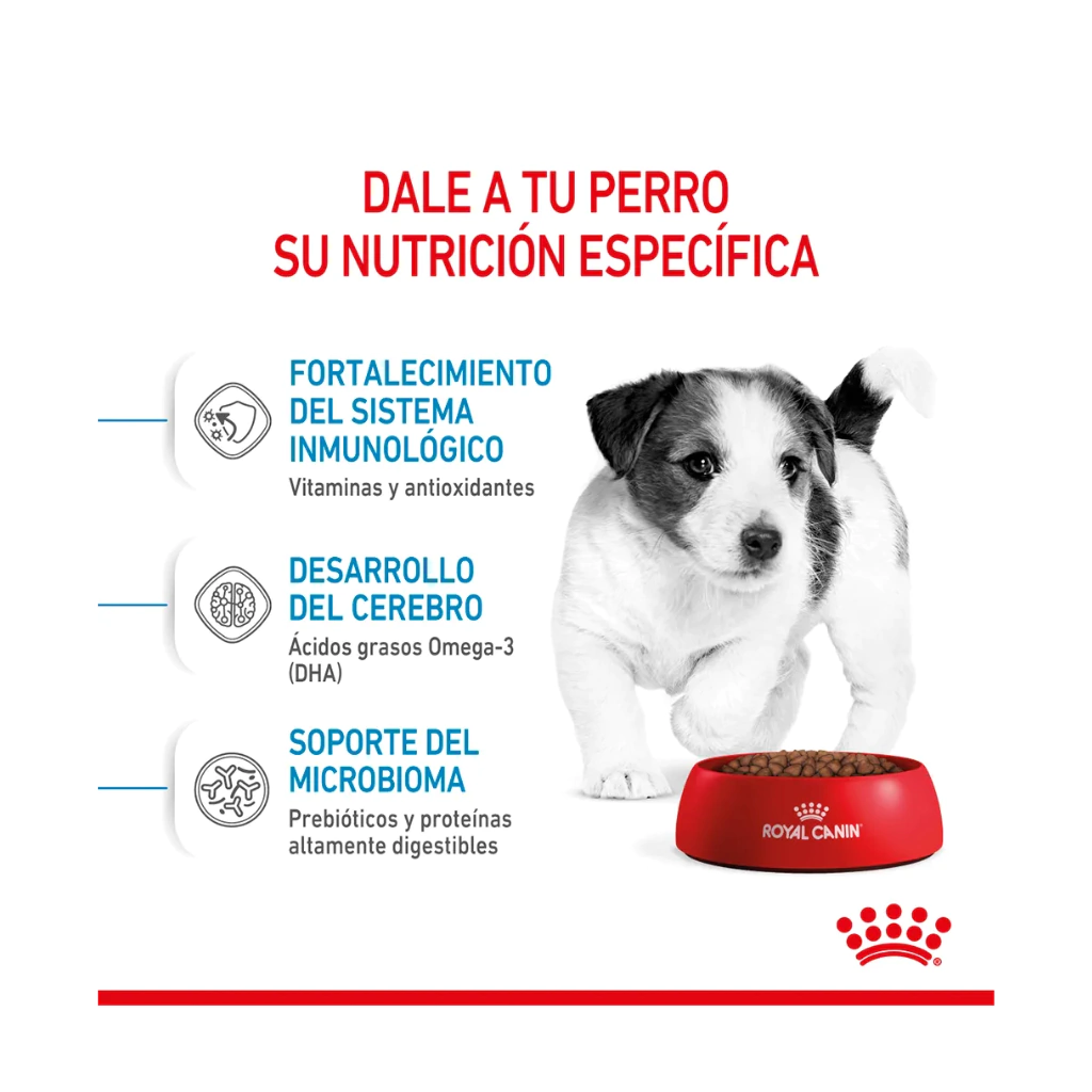 Alimento para perros cachorros de talla pequeña (peso adulto menor a 10 kg), desde los 2 hasta los 10 meses de edad. Royal Canin Mini Puppy ayuda a reforzar las defensas naturales del cachorro gracias a un exclusivo complejo de antioxidantes, incluyendo vitamina E. Esto se debe a que mientras crece, el cachorro experimenta grandes cambios y nuevos descubrimientos, y durante este periodo clave, su sistema inmunológico sigue desarrollándose gradualmente. Su fórmula con proteínas de alta calidad (L.I.P.*) y prebióticos (FOS) ayuda a favorecer la salud digestiva y el equilibrio de la flora intestinal, contribuyendo a la buena calidad de las heces. Cubre las necesidades energéticas de los cachorros de razas pequeñas durante el período de crecimiento y satisface su apetito caprichoso.