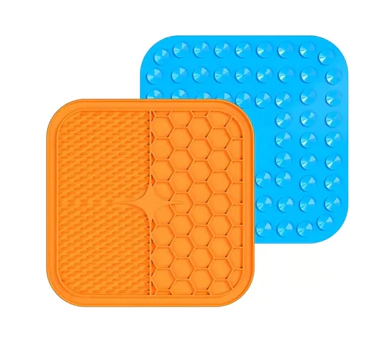 La mitad del tapete está diseñada con bloques hexagonales para funcionar como comedero lento, obligando a tu mascota a comer más despacio. La otra mitad tiene texturas suaves para que lama yogur, mantequilla de maní, calabaza o snacks, lo que ayuda a reducir la ansiedad y liberar endorfinas.